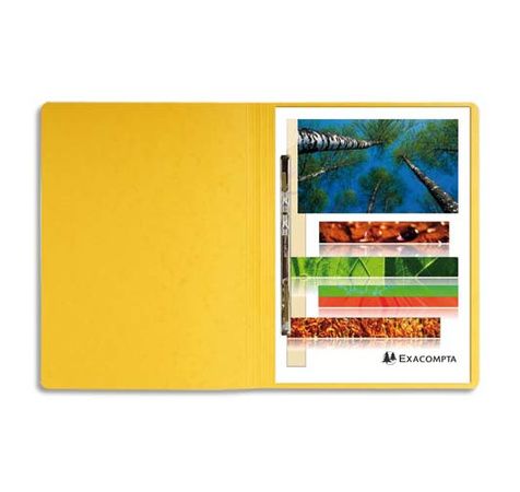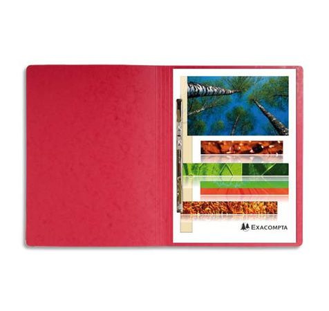 En carte lustrée 5/10e, 410 g. Mécanisme à lamelle et compresseur. Capacité : environ 350 feuilles. Coloris assortis : bleu, jaune, rouge, vert foncé. Dimensions : 24 x 32 cm. Format A4. Conditionnement conseillé : 25