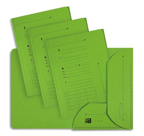En kraft résistant 240 g, renforcé par des fibres de coton. Couverture et rabats pré-imprimés. Capacité 200 feuilles. Coloris assortis : 7 bleu, 6 jaune d'or, 6 vert, 6 rouge. Dimensions : 23,5 x 31,5 cm. Pour format A4. Couleur : Vert