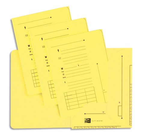 En kraft résistant 240 g, renforcé par des fibres de coton. Couverture et rabats pré-imprimés. Capacité 200 feuilles. Coloris assortis : 7 bleu, 6 jaune d'or, 6 vert, 6 rouge. Dimensions : 23,5 x 31,5 cm. Pour format A4. Couleur : Jaune