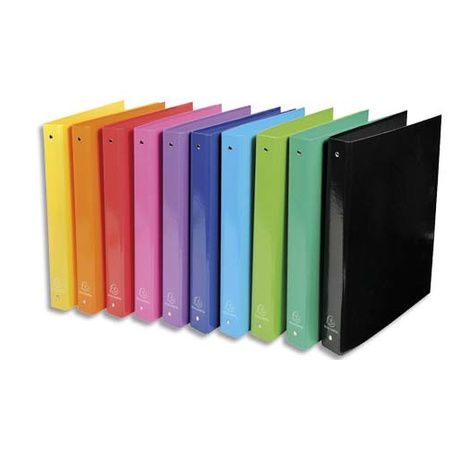 Couverture en carton 18/10e recouvert de papier pellliculé. Intérieur papier à la couleur du classeur. Dos 4 cm. Mécanisme 4 anneaux ronds Ø 30 mm.