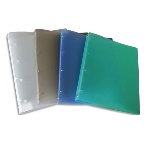 Couverture en polypropylène translucide. Mécanisme 4 anneaux ronds. Coloris assortis : gris, incolore, vert menthe, bleu. Dimensions : 31 x 24,5 cm. Pour format A4. Conditionnement : 12