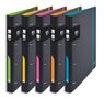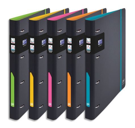 Couverture en polypropylène opaque 20/10ème. Dos 3cm. Mécanisme 4 anneaux en D Ø 30 mm. Pochette intérieur. Ouverture de la couverture à 360° . Fermeture par élastique. Dimensions : 25,5 x 32 cm. Pour format A4. Coloris assortis : noir intérieur orange, noir intérieur turquoise.