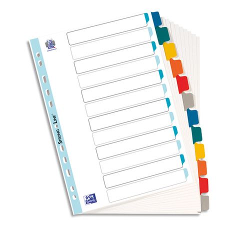 En carte renforcée sur les perforations. Onglets renforcés larges et colorés, effaçables et réinscriptibles pour corriger une erreur ou réutiliser les intercalaires.