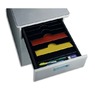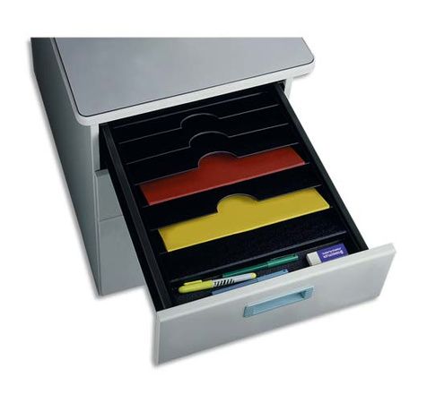 En polystyrène haute résistance noir à cases obliques. S'adapte aux tiroirs standard. Entraxe 330. Pour documents 24 x 32 cm. 1 plumier à chaque extrémité.