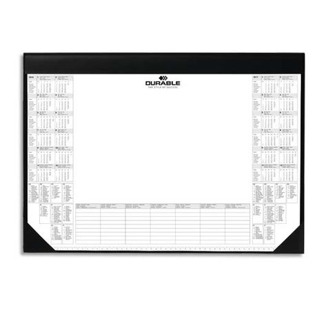 En PVC noir avec calendrier intégré, 25 feuilles. Impression noire et grise sur papier blanc (réglet, grand espace de notes). Dessous mousse antidérapant. Dimensions (l x p) : 59 x 42 cm.