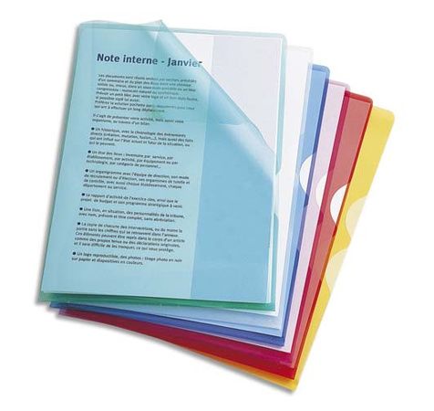 En PVC 14/100e transparent avec 2 encoches de préhension latérales. Grande capacité (jusqu'à 100 feuilles). -Coloris assortis : jaune, rouge, bleu, vert, mauve, incolore.