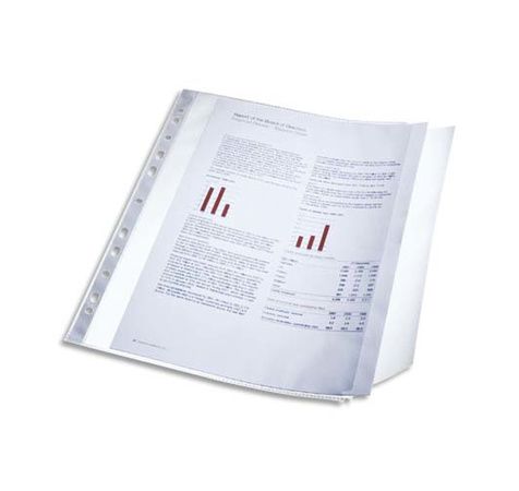 En polypropylène grainé 9/100e. Ouverture latérale avec rabat sur le côté droit sur toute la longueur. Bande de renfort avec perforation de 11 trous-Peut contenir jusqu'à 40 feuilles. Sachet de 10.