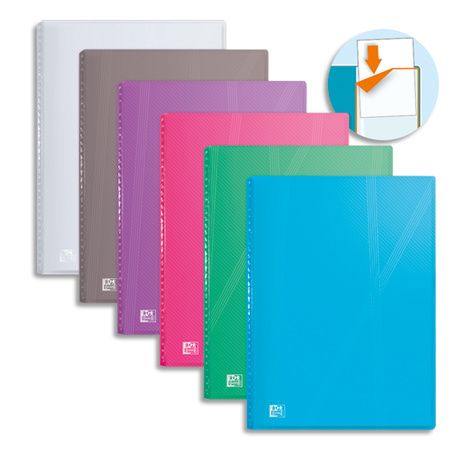 Couverture en polypropylène lisse ligné 5/10e. Pochettes intérieures en polypropylène 5/100e lisse, ouverture en angle, format A4. Coloris assortis : bleu, rose, gris, violet, vert, incolore.