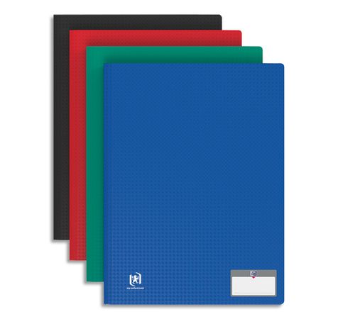 Couverture en polypropylène opaque 3/10e (format A4) et 7/10e (format A3). Grain structure satiné, anti– traces. Pochettes intérieures en polypropylène 6/100e lisse, ouverture en angle. Assortis tradition : bleu, rouge, vert, noir. Assortis style : bleu lavande, vert anis, violet, rose, turquoise.