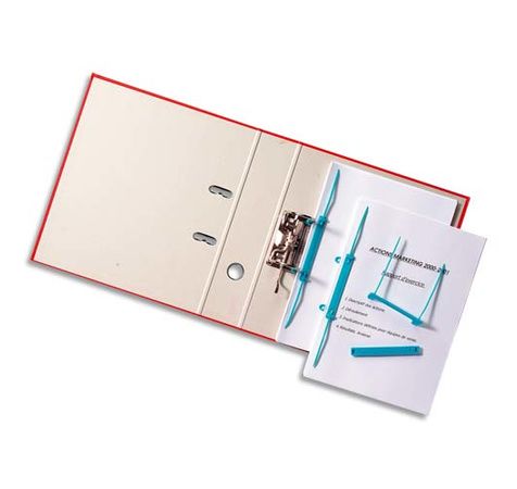 Attache pour documents perforés en plastique haute résistance. Système de fermeture crantée. Etiquetage possible sur le dessus de l'attache. Poignée de transfert facilitant la transposition des documents. Ecartement perforation : 8 cm.