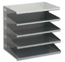 En métal avec revêtement époxy polyester. 5 compartiments pour documents A4 et jusqu'au format 24 x 32 cm. Porte-étiquette sur le côté. Se pose sur un bureau ou se fixe au mur.