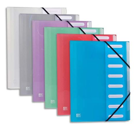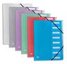 Couverture en polypropylène transclucide 4/10ème. Compartiments en polypropylène 3/10ème, touches neutres. Feuille d'indexation amovible sur la 1ère de couverture, pochette 3 rabats sur la 4 ème de couverture. Fermeture par élastique.Dimensions : 24 x 32 cm. Coloris assortis : framboise, bleu, incolore, gris, violet, vert pomme.