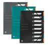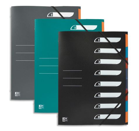Couverture en polypropylène 5/10e, intérieur en polypropylène 3/10e, 8 touches neutres. Etiquette de dos. Indexation sur la 1ère de couverture. Repère numérique. Fermeture par élastique. Ecriture possible sur les touches. Pochette 3 rabats en 3ème de couverture. Dimensions : 24,5 x 32 cm. Coloris assortis : 6 noir, 3 vert, 3 gris.
