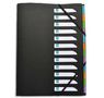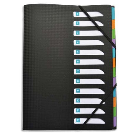 En polypropylène 5/10e grain structuré. Intérieur en polypropylène incolore, touches neutres multicolores. Pochette 3 rabats en 3ème de couverture, indexation sur la 1ère de couverture avec repère numérique. Fermeture par élastique.