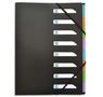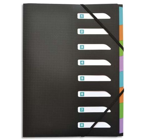 En polypropylène 5/10e grain structuré. Intérieur en polypropylène incolore, touches neutres multicolores. Pochette 3 rabats en 3ème de couverture, indexation sur la 1ère de couverture avec repère numérique. Fermeture par élastique.
