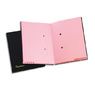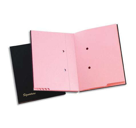 Couverture plastifiée rembordée. Dos extensible . Intérieur en buvard rose 250 g avec 2 perforations.