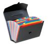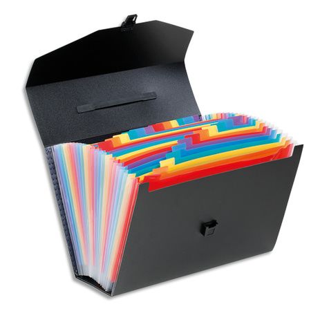 En polypropylène 10/10e, noir, intérieur multicolore, 26 compartiments. Dos de 12 cm. Fermoire tuck en plastique. Dimensions : 38 x 25,5 x 12 cm. Pour format A4. Conditionnement conseillé : 6