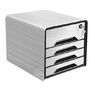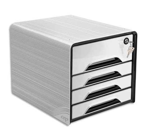 Module monobloc en polystyrène ultra robuste 100 % recyclable 4 tiroirs. Conforme à réglementation RGPD, le tiroir du haut se ferme à clé pour protéger documents confidentiels et objets personnels. 2 tailles de tiroirs acceptant jusqu'au format 24 x 32 cm : 1 maxi tiroir H 8,5 cm et 3 tiroirs H 4 cm. Livré avec patins antidérapants et étiquettes d'indexation.