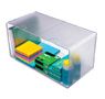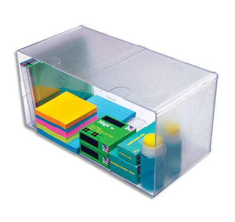 En polystyrène. Peut être empilé à la verticale ou à l'horizontale. Clips métal pour assembler les cubes entre eux pour une solution sur mesure. Dimensions (l x h x p) : 15.2 x 15.2 x 18.2 cm.
