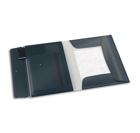 En polypropylène opaque, finition mate. Fermeture par élastique vertical rouge. Pochette intérieure extensible, fermeture à bouton-pression pour stylos, câbles, téléphone, bloc-notes....