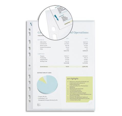 En polypropylène transparent 7/100e lisse cristal. Perforation 11 trous. Bande de renfort transparente incurvée vers le haut pour faciliter l'insertion des documents.