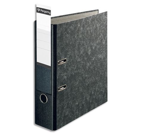 En carton, corps recouvert de papier gris effet marbré. Intérieur papier gris clair. Renfort métallique, oeillet de préhension, griffe de blocage. - Etiquette de dos adhésive pour les dos de couleur. Porte-étiquette soudé et étiquette pour les dos corps gris marbré.