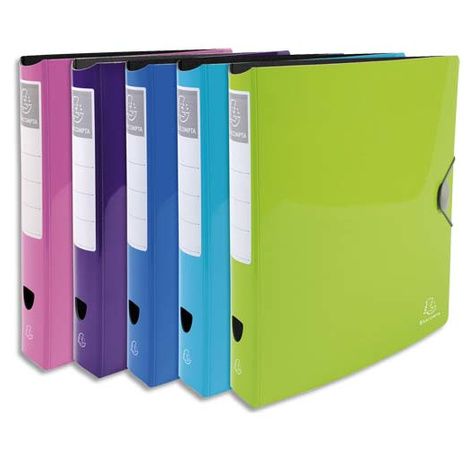 Couverture en polypropylène opaque 5/10ème rigide. Dos 4 cm. anneaux Ø 30 mm. Étiquette de dos adhésive. Dimensions 26 x 32 cm. Pour format A4. Coloris assortis : bleu foncé. vert anis. rose. violet. bleu turquoise.