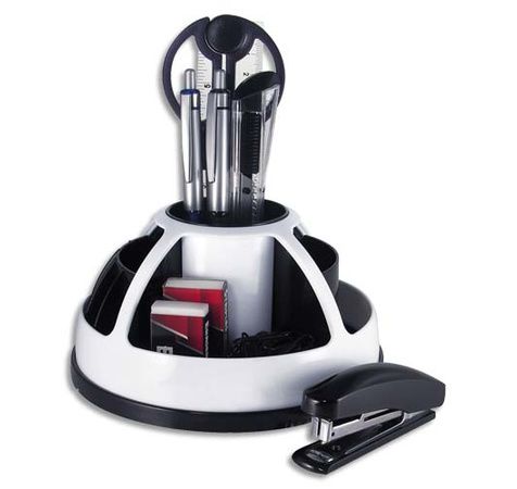 Set de bureau rotatif livré complet avec 9 produits : ciseaux, agrafeuse, agrafes, cutter, règle, stylo bille, porte-mine, trombones, gomme. 11 compartiments. Coloris noir et blanc.