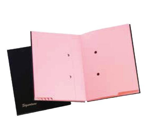 Couverture plastique rembordée avec porte-étiquette. Intérieur buvard rose sur pattes collées, feuillets simples encochés. Dos extensible. Trous de visualisation. Format : 24x32 cm. Coloris noir
