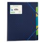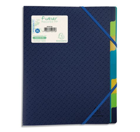 En polypropylène opaque recyclé 7/10e avec effet grain texturé, issu du recyclage des déchets plastiques ménagers. Compartiments couleur en 3/10e, 8 touches neutres. Pochette 3 rabats en 3ème de couverture. Fermeture par élastique.