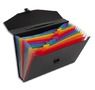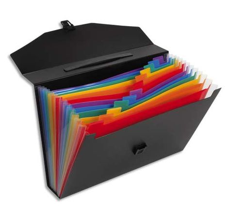 En polypropylène 10/10e, noir, intérieur multicolore. Poignée de transport rétractable. Fermoir Tuck en plastique. Dimensions : 38 x 25,5 cm. Pour format A4. Conditionnement conseillé par 8