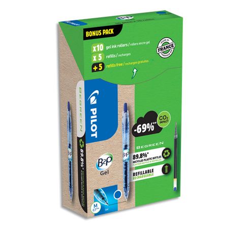 Pack promo de 10 stylos à pointes moyennes B2P Gel + 10 recharges à -50%. Coloris bleu