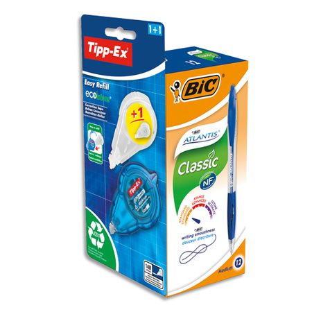 Pack de 12 bille Atlantis pointe moyenne Bleue + 1 Roller de correction Easy Refill 5 mm x 14 m