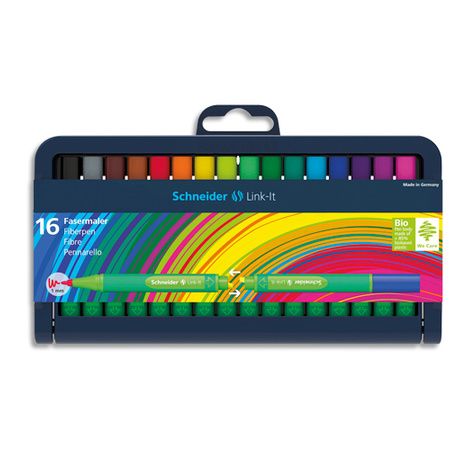 Link It Stylo fineliner pointe fine 0,4 mm et pointe feutre 1 mm. - Corps triangulaire de couleur vert foncé caoutchouté pour une parfaite tenu en main. Corps fabriqué à 88 % en bio-plastique. Pointe fineline 1,0 mm Pochette de 16