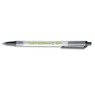 Bille rétractable. Corps translucide. Embout et bouton poussoir, clip à la couleur de l'encre. Ecriture moyenne.