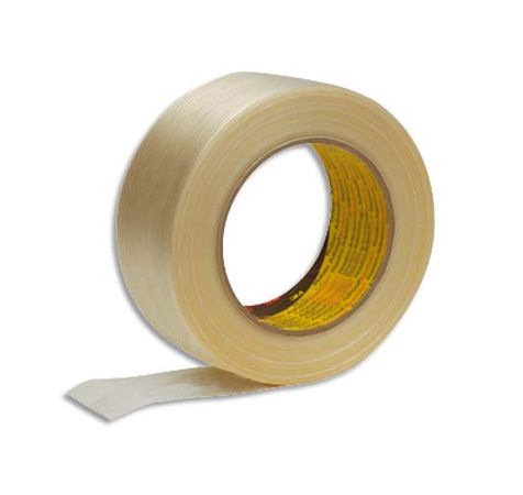 Ruban armé, renforcé de fils de verre. Indéchirable dans la largeur. Idéal pour le banderolage et le cerclage. 131 microns .