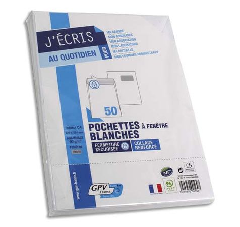 Paquet de 50 pochettes vélin blanc auto-adhésives 90g C4 229x324mm fenêtre 50x100mm