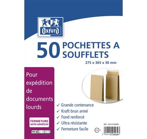 OXFORD Paquet de 50 pochettes kraft armé blond auto-adhésives 120g format 275x365 mm à soufflets de