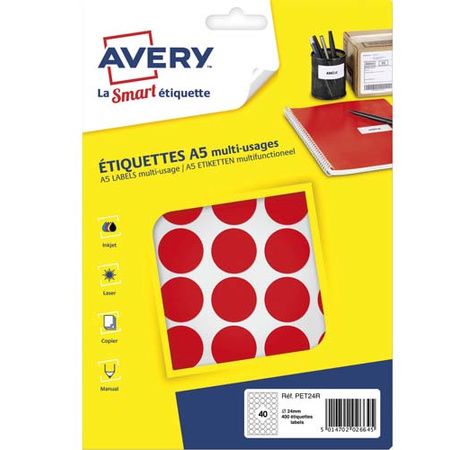 Compatible avec toute imprimante laser, jet d'encre, copieur. Idéale pour marquer vos documents : planning, inventaires, plans, etc. Feuille format A5 présentées sous sachet. Modèles et logiciels gratuits sur www.avery.fr