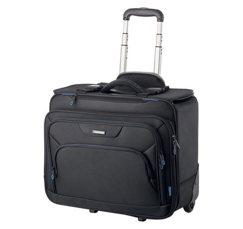 Valise pilote avec système téléscopique verrouillable, porte-adresse au dos, un compartiment zippé avec partie rangement et deux poches-filet, trois autres compartiments zippés. Finition intérieure : compartiment notebook, compartiment séparé, grand compartiment principal. - Couleur noir. - Matériel polyester.