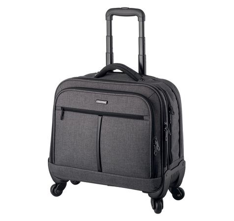 Valise Business Laptop Trolley avec roulettes pivotantes 360°, compartiment principal zippé avec compartiment matelassé avec trois compartiments, compartiment zippé à l'avant, porte-adresse caché à l'arrière, sangle pour trolley. - Couleur gris. - Matériel polyester.