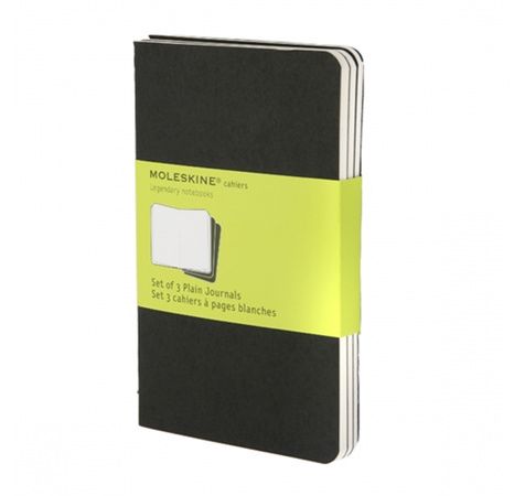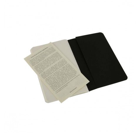 Les Cahiers Moleskine ont une couverture noire cartonnée souple et résistante à couture apparente au dos. Les 16 dernières pages sont détachables et une pochette intérieure permet de conserver des feuillets. Chaque set de 3 cahiers contient l’histoire du Moleskine. Les pages blanches sont en papier sans acide.