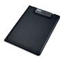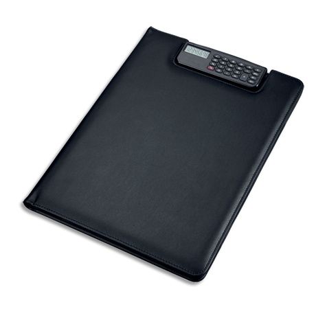 En PU noir imitation cuir. Livré avec un bloc quadrillé A4, calculatrice clip, compartiments multiples et porte-stylo.
