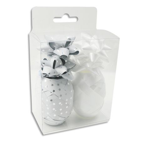 Boîte de 2 bolducs (1 œuf uni et 1 œuf imprimé étoile) et 4 nœuds (2 noeuds unis et 2 noeuds imprimés étoile).