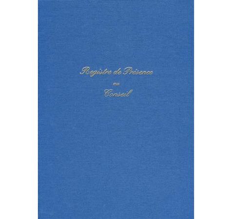 Registre de présence de 104 pages, folioté de 1 à 51. Impression 2 couleurs, page titre personnalisable, titre frappé en 1ère de couverture. 2 tranches files rouges et signet marque-page. Papier registre supérieur 100 g/m2 Imprimé en noir et rouge. Couverture pleine toile couleur. Coloris bleu.