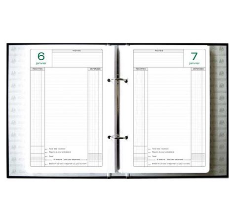 1 jour par page avec recettes et dépenses. Couverture carton, reliure brochée.