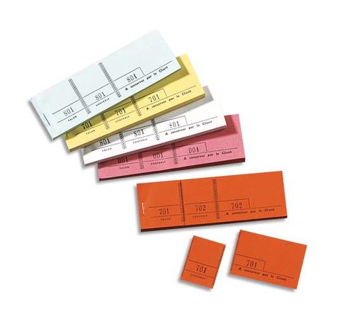 Bloc de 100 feuillets en papier 55 g numéroté de 1 à 1000, composé de 3 coupons (souche, contrôle, client) détachables. Dos toilé. Dimensions : : 4,8 x 15 cm. Couleur : Blanc Conditionnement minimum : 10