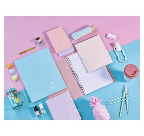 48, 96 ou 140 pages. Couverture polypropylène 4/10e. 2 rabats marque-page avec pochette intégrée pour le rangement des documents. Papier vélin velouté 90 g certifié PEFC. Coloris assortis. Les assortis translucides et opaques sont vendus dans des boîtes prêt à vendre, les pastel sont vendus sous film.