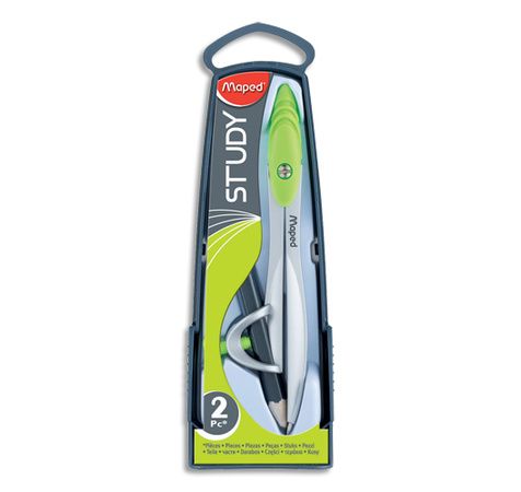 Compas à bague 2 pièces. Bonne rigidité, branches métal. Boîte avec couvercle coulissant. Coloris assortis : vert, gri, rose.