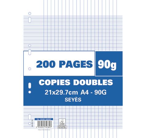200 ou 400 pages perforées. 9 trous et coins arrondis. Réglure grands carreaux Seyès (2 couleurs) ou quadrillé 5x5. Papier 70 g ou 90 g. Format 21 x 29,7 cm (A4). Conditionnement conseillé : 10